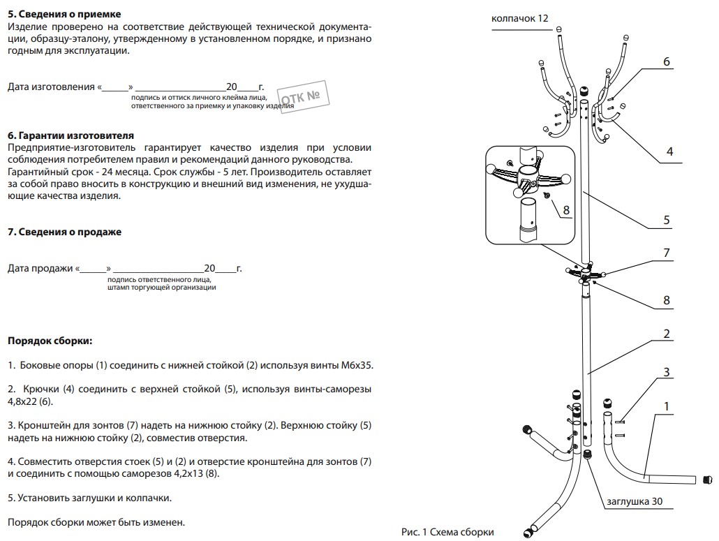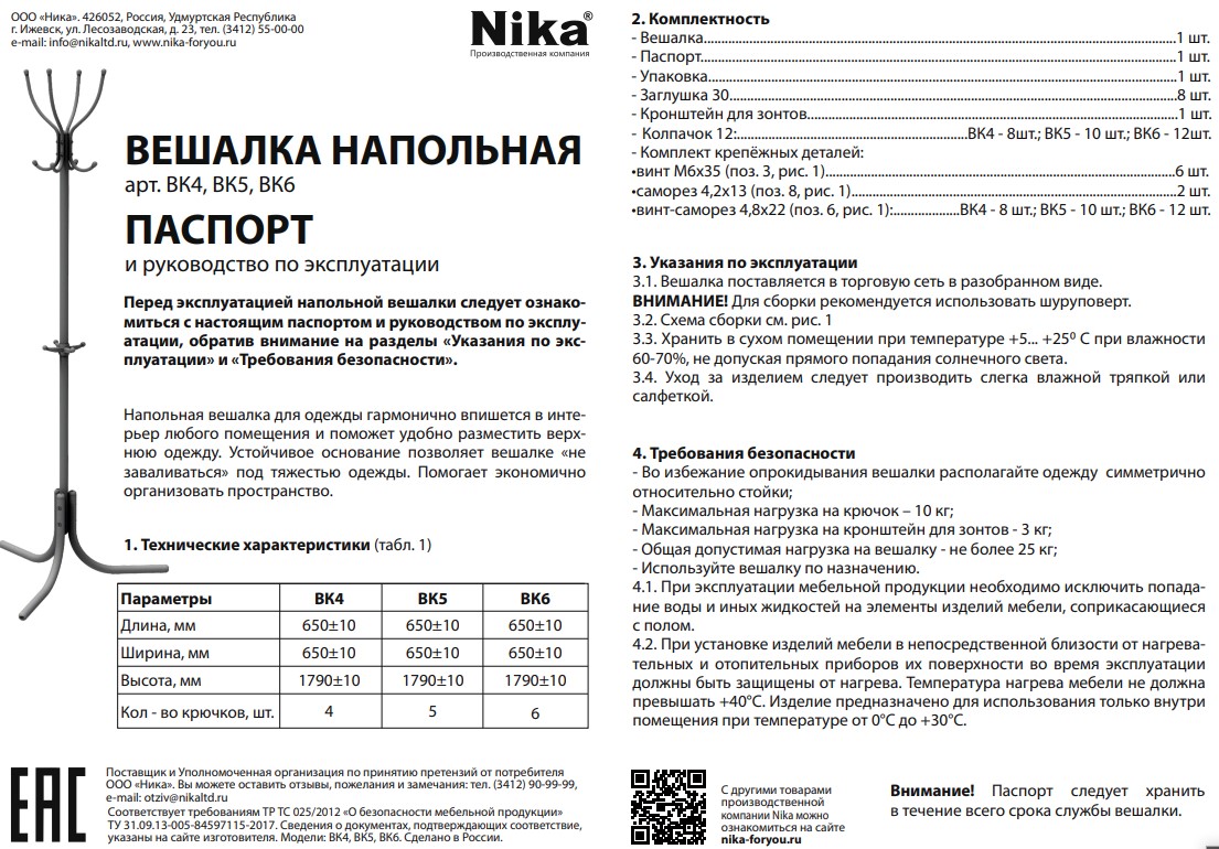 Максимальная нагрузка: на вешалку - 25 кг, на крючок - 10 кг
