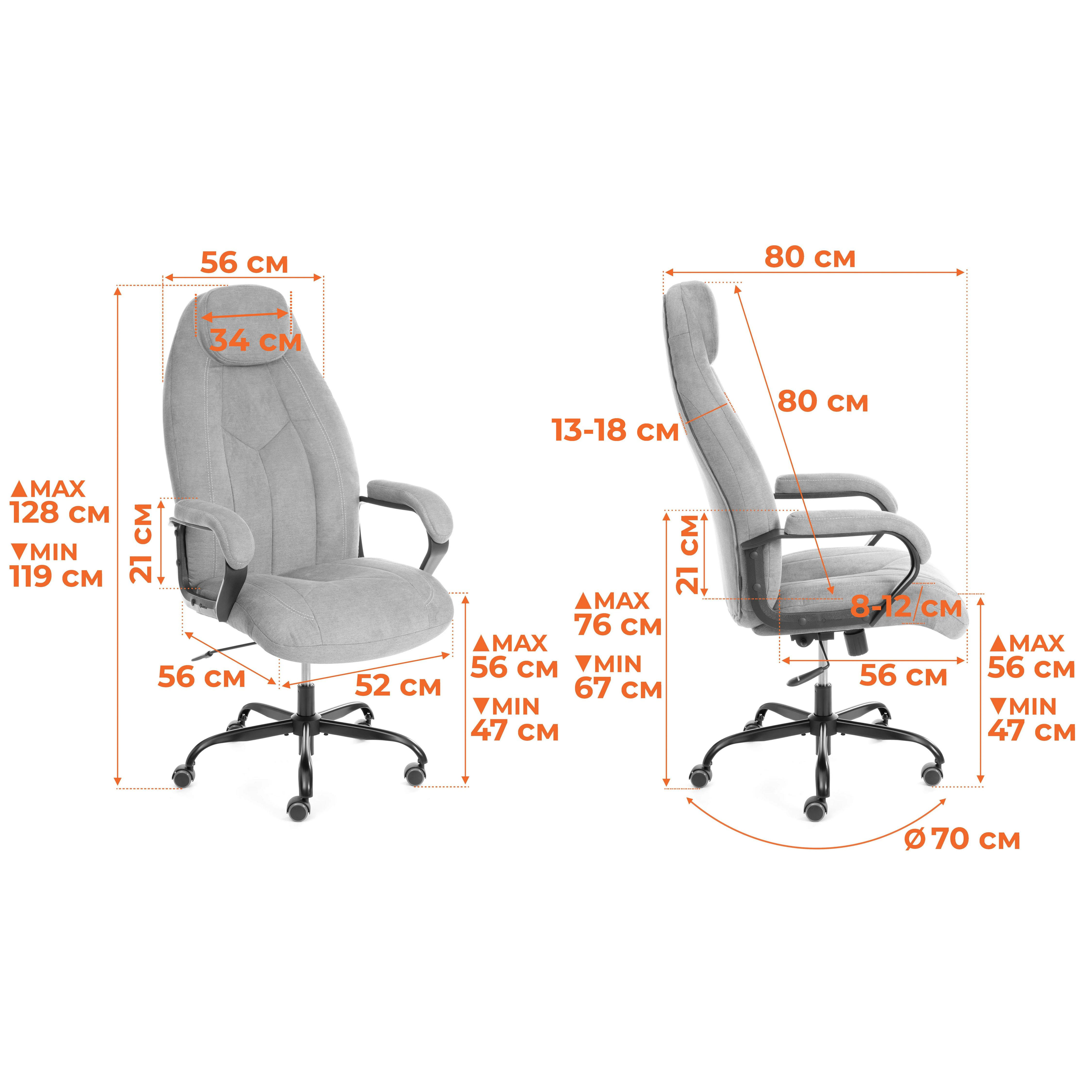Практичное и функциональное компьютерное кресло Boss metalBL – необычный акцент в пространстве вашего дома или офиса. Модель прекрасно подойдет как для кабинета руководителя, так и для переговорной комнаты. Сиденье с мягким наполнителем из пенополиуретана стандартной плотности (до 35 кг/м2) уменьшит усталость при длительной работе. Каркас офисного кресла изготовлен из фанеры толщиной до 15 мм. Такой материал обладает отличными эксплуатационными качествами, прочностью и долговечностью. Кресло регулируется по высоте и наклону с фиксацией в нескольких положениях до 15 градусов. Жесткость механизма качания настраивается при помощи специального барабана. Стальная (разборная) крестовина надежна, основательна и устойчива. Ролики из полиуретана с прорезиненными вставками не шумят при перемещении, не оставляют следов на напольном покрытии. Ролики и крестовина в креслах бренда TETCHAIR соответствуют стандарту BIFMA. Во всех креслах бренда TETCHAIR используются газлифты 3 класса, он способен выдерживать вес до 120 кг. Удобный подголовник и фиксированные пластиковые подлокотники с мягкими накладками снизят нагрузку на шею и плечевой пояс. Оригинальное офисное кресло Boss metalBL , обитое высокопрочной износостойкой экокожей или флоком, представлено в нескольких вариантах. Обивка используемая при изготовлении кресла, выдерживает до 50 000 циклов на истирание по Мартиндейлу. Эргономичная модель подчеркнет безупречный вкус владельца, будет радовать своей долговечностью, презентабельностью и практичностью продолжительное время. Максимальная нагрузка 120 кг. Модель поставляется в разобранном виде. Требуется простая сборка по прилагаемой инструкции. Высота кресла (от пола до самой верхней точки кресла): 119 Габаритная глубина кресла (от крайней задней точки спинки до передней точки сиденья): 67 Ширина кресла по внешним сторонам подлокотников: 80 Страна производства: РОССИЯ;Бренд: Tetchair |