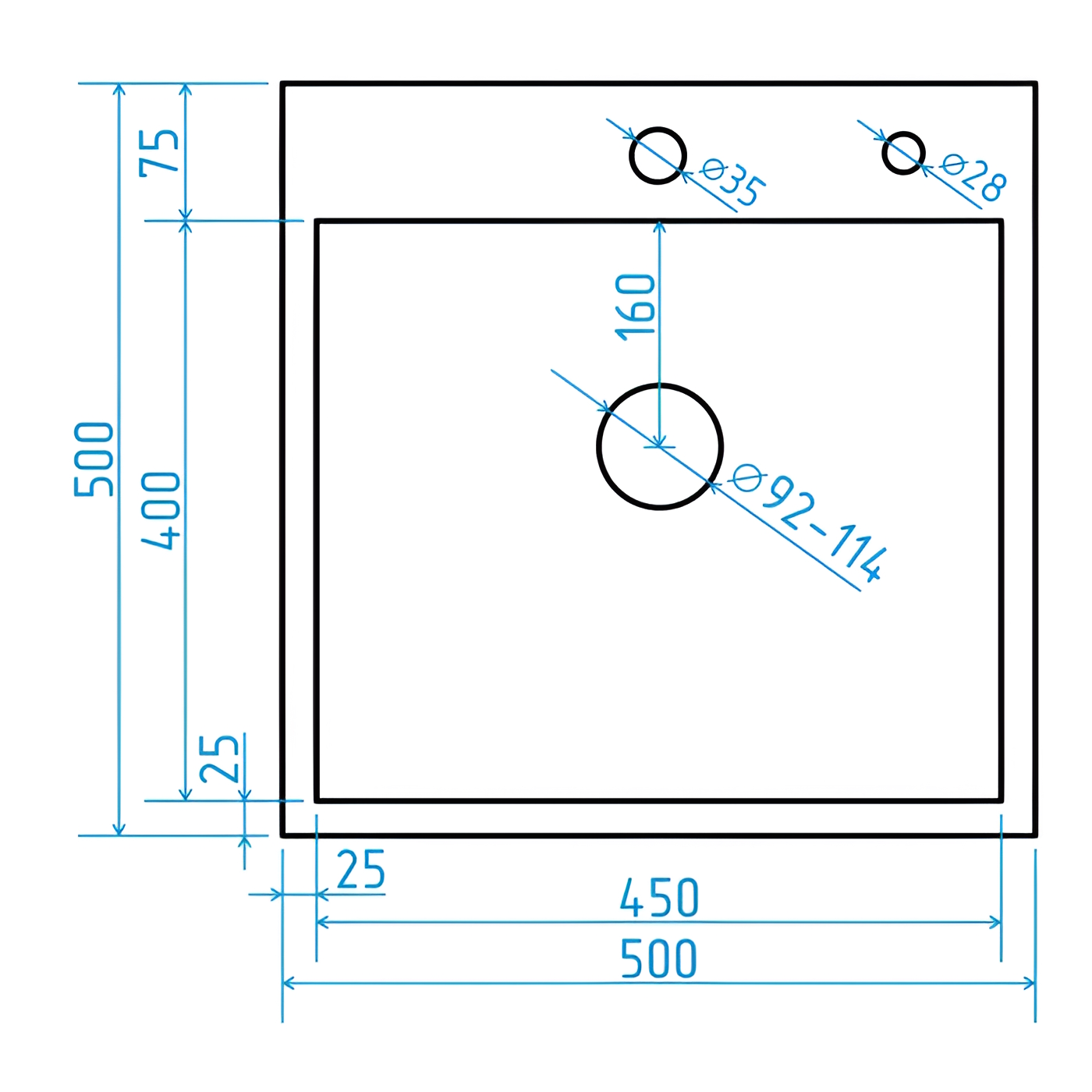 Размеры: 500 × 500 мм — квадратная форма, подходит для тумбы от 55 см, идеальна для просторных кухонь