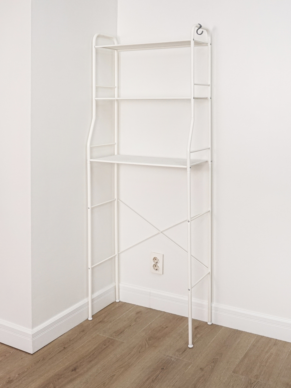 Стеллаж изготовлен из металла с порошково-полимерным покрытием, что обеспечивает его долговечность и устойчивость к коррозии. Пластиковые элементы добавляют эстетическую привлекательность и облегчают уход за изделием.